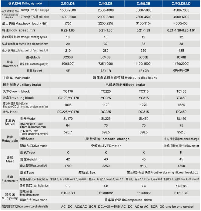 The rotary table of the composite drive drilling rig is driven by electricity, and the winch and mud pump are driven by diesel engines, overcoming the problems of high cost of electric drive, mechanical transmission route, and climbing drive of the rotary table of the mechanical driven high drilling platform. It meets the requirements of modern drilling technology and has strong market competitiveness. The main models include ZJ30LDB, ZJ40LJDB, ZJ50LJDB, ZJ70LDB and other drilling rigs.