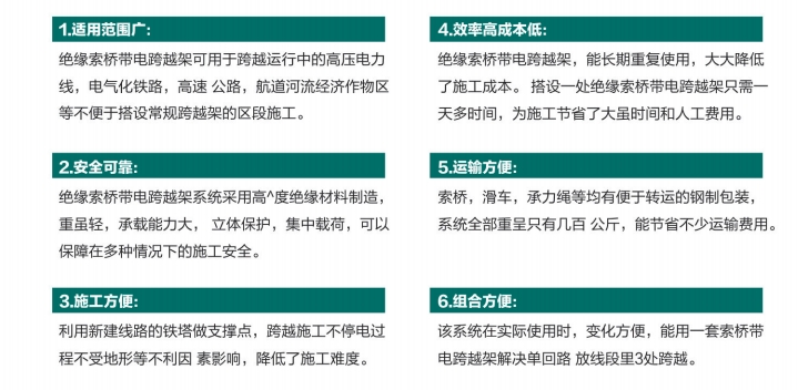 | 为配合国家电力部门重点750kV施工项目,绝缘索桥带电跨越架施工技术是当前国内*为先进且*省钱的带电跨越技术。 该项新技术不需要架设传统的支撑跨越架,它利用跨越档两端的电力铁塔作为支撑,中间悬挂绝缘索桥来实施带电跨越,它具有以下特点: