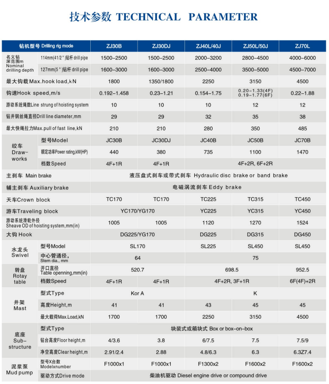 技术特点 ● 采用“柴油机+液力变矩器(或偶合器正车箱)+链条并车箱”“柴油机+减速器+窄V带并车”或“柴油机+ALLISON变速箱+齿轮箱并车”等驱动方式,功率利用率高,满足不同钻井工况的需要; ● 绞车有内、外变速两种,主刹车采用带式刹车或液压盘式刹车,辅助刹车采用电磁涡流刹车。气动远程控制绞车换档,操作简便; ● 配捞砂滚筒、机械摩擦猫头和转盘驱动装置。拆装方便; ● 4000米以上级别钻机主机采用“前高后低”方式布置,动力和传动系统低位安装; ● 满足丛式钻井时井位间迁移的要求: ● 通过PLC实现钻机智能化司钻控制。